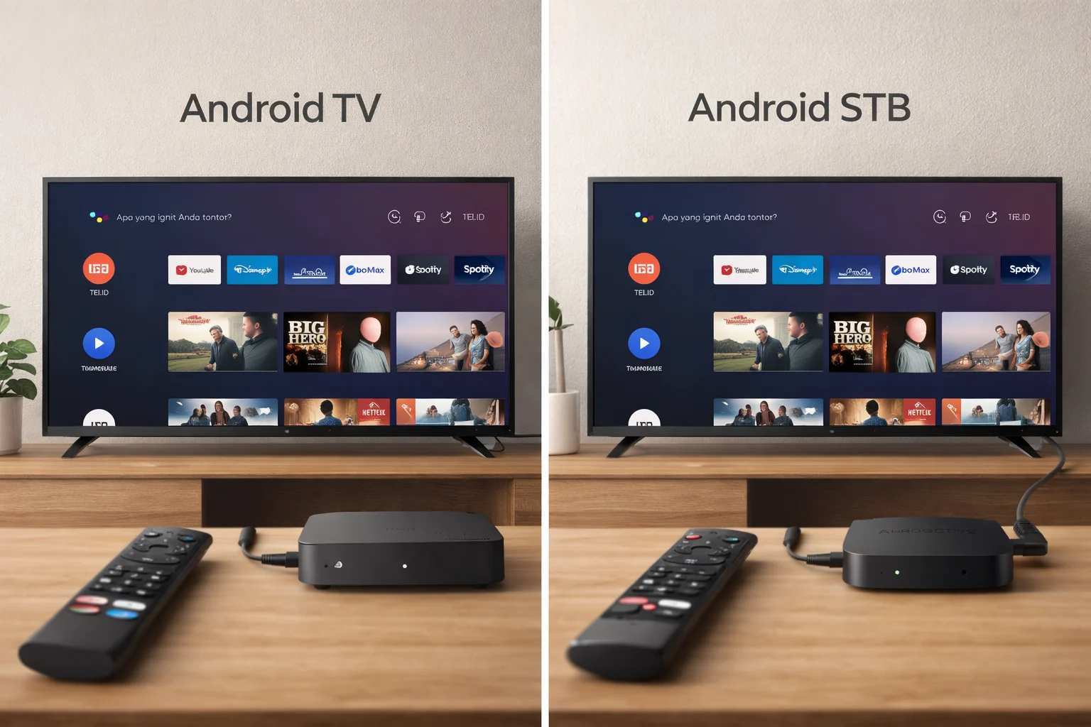 Sementara itu, STB Android adalah perangkat eksternal yang dihubungkan ke TV melalui HDMI. Fungsinya adalah mengubah TV biasa menjadi Smart TV dengan kemampuan menjalankan aplikasi berbasis Android.