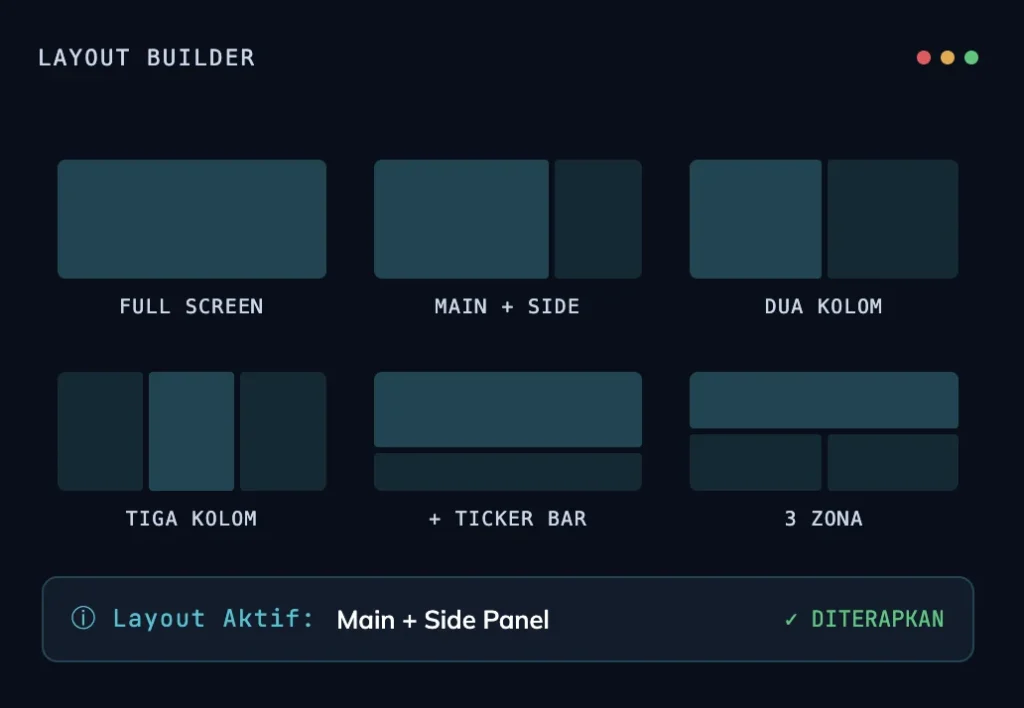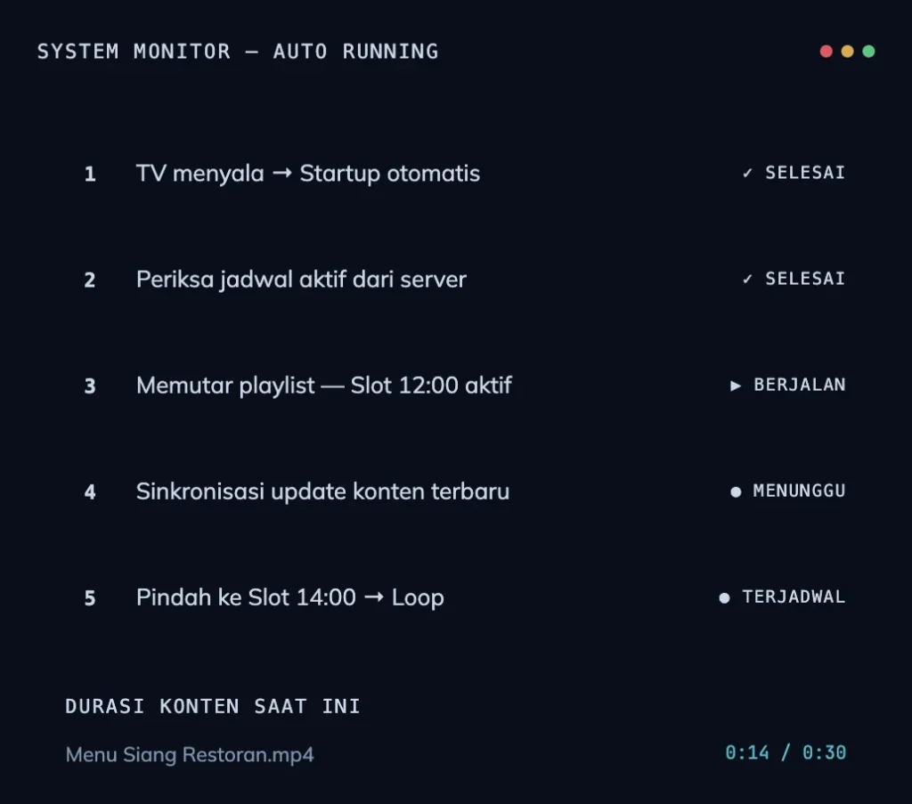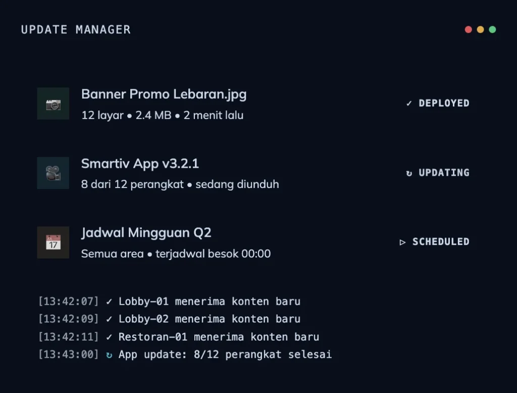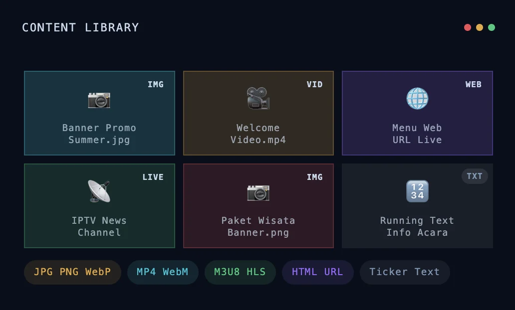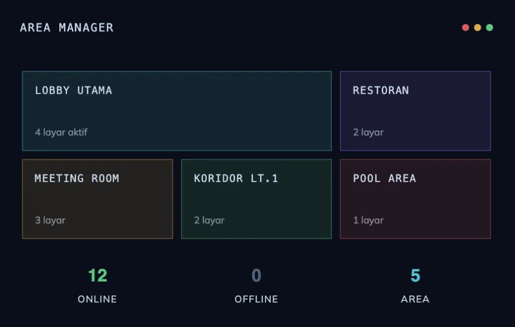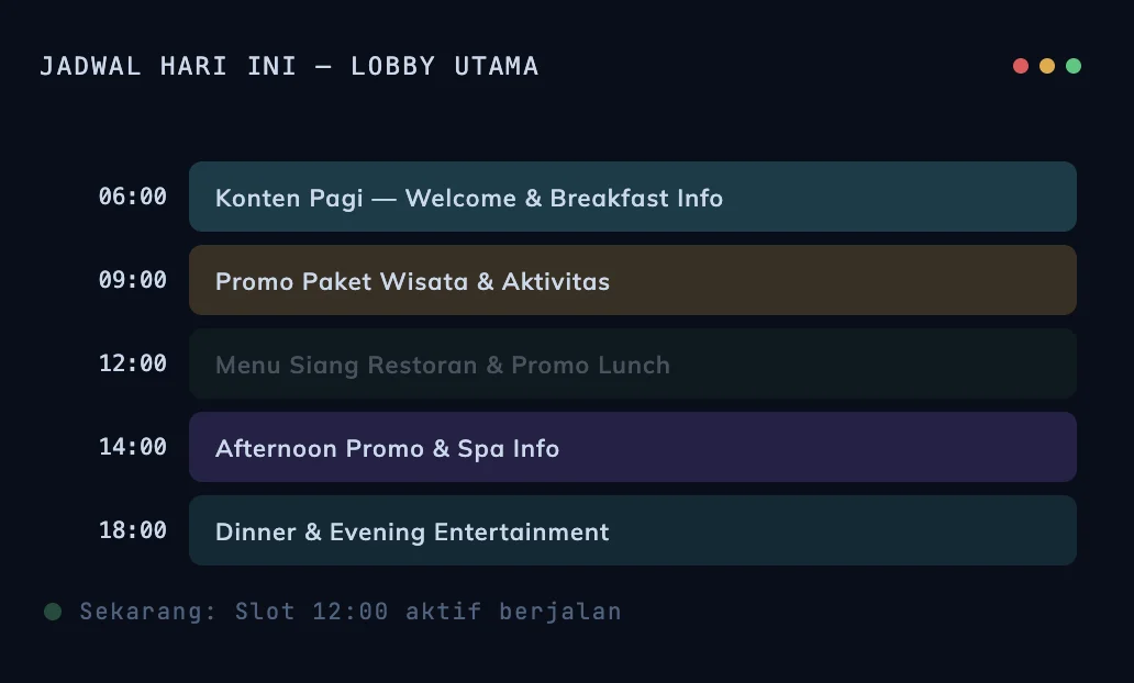 | Digital Signage | Lobby, kiosk, video wall | Display konten promosi/informasi di layar publik terjadwal |