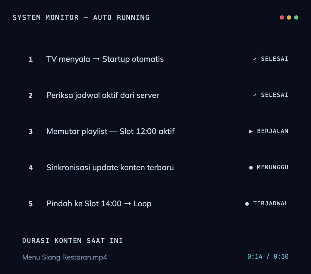 Solusi media display digital untuk menampilkan konten informasi, promosi, dan branding secara dinamis di berbagai layar seperti TV, kiosk, maupun video wall.