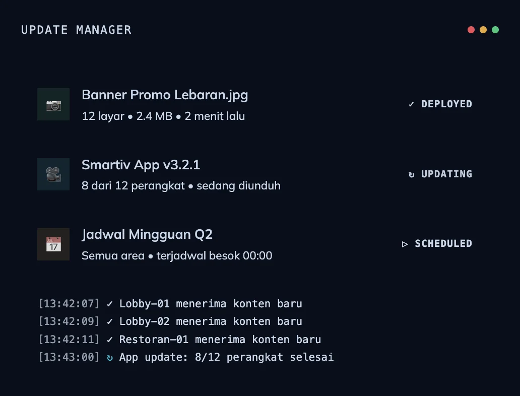 Update dapat dilakukan dua cara: otomatis via Google Play Store (jika auto-update aktif) — admin memicu update ke semua perangkat sekaligus tanpa menyentuh TV satu per satu. Setiap update didokumentasikan di halaman Changelog Smartiv.